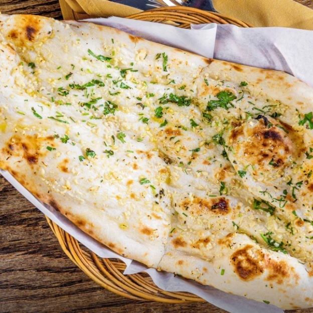 Flat bread with toppings of garlic and basil cooked in the tandoor