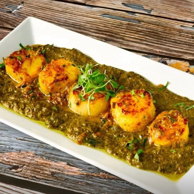 Scallops marinated with Indian spices flambé with rum and served on top of spinach
