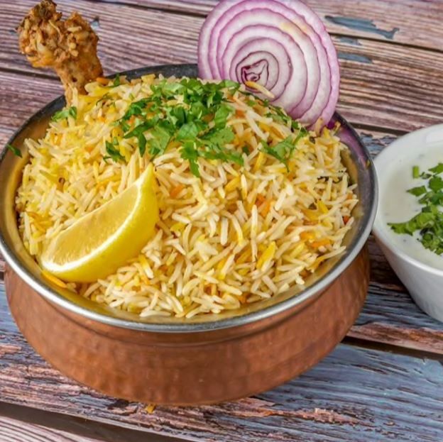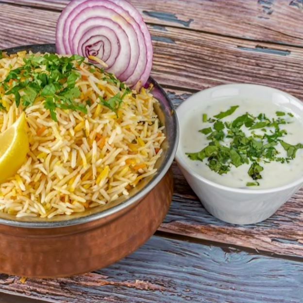 Basmati rice cooked with chicken, mint and flavored with Indian spices cooked on low heat. Served with yogurt dressing