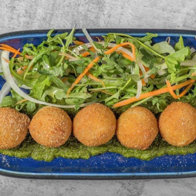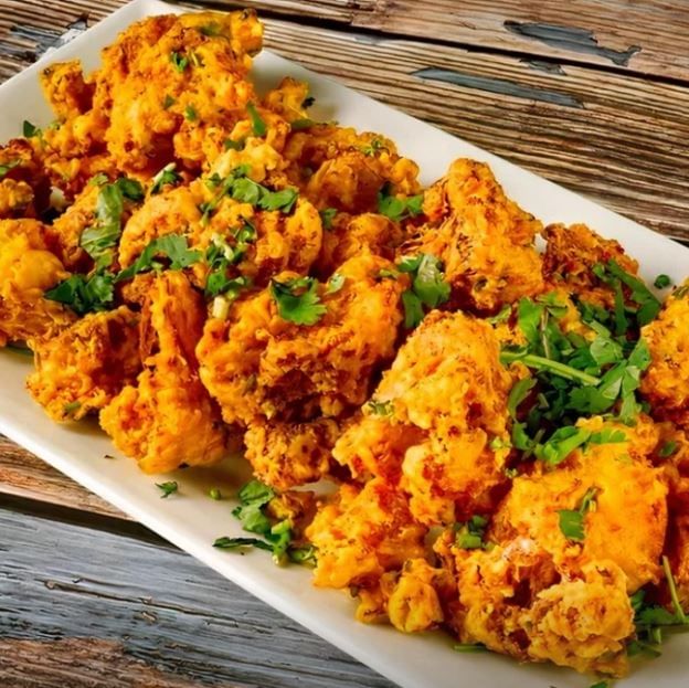 Crispy cauliflower fritters. Served with mint and cranberry chutney