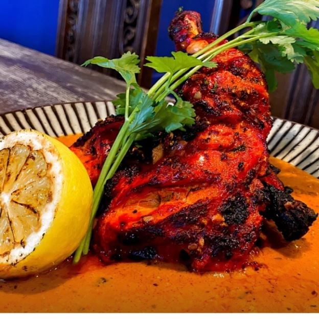 Tandoori chicken served over chef special flambe rum makhani sauce