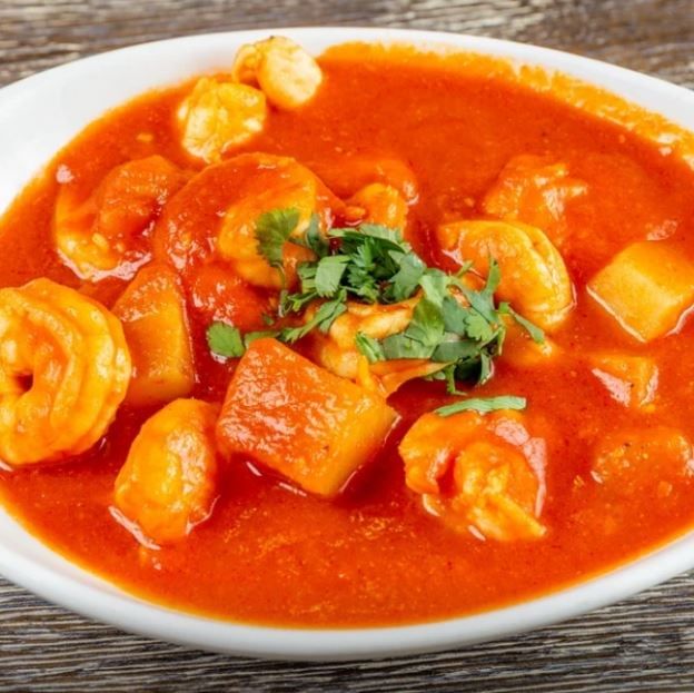 Shrimps and potatoes sautéed with chopped onions, tomato sauce, vinegar and chili peppers