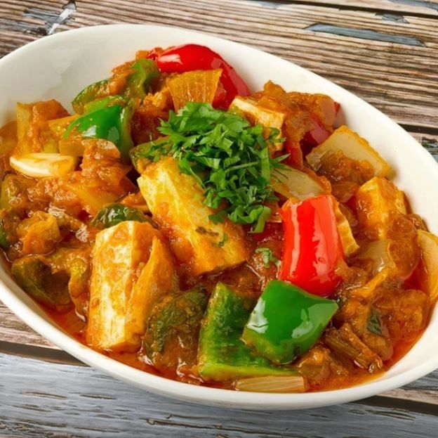 Indian cottage cheese and bell peppers cooked in a tomato and onion gravy