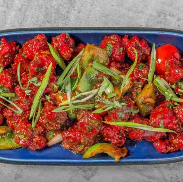 Cubes of fried crispy chicken, tossed in a spicy and tangy sauce made with soya sauce, vinegar, chili sauce